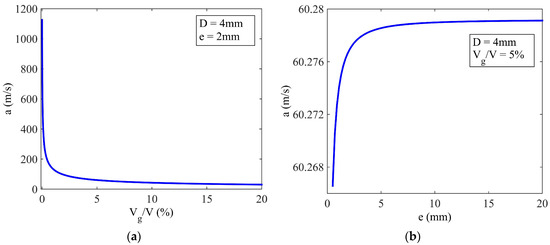 The ideal wave speed is believed to be larger than 1000 m/s in water or some organic liquids [19,20]. However, the wave speed in the fluid-based angular accelerometer has been found much smaller than the ideal value, even less than 100 m/s [15,17]. The models in Section 3.2 were evaluated to analyze the impact of wave speed in the water flow in a glass circular tube. The relationships of the gas volume and tube wall thickness versus the wave speed are shown in Figure 7, and the parameters used in the simulation are listed in Table 2 [19,35]. It is evident that a little gas in the tube would lead to a great decay of the wave speed. When the gas volume is 5% of the total volume of the fluid, the wave speed in the liquid declines to 60 m/s. In Figure 7b, a thicker tube wall results in increased wave speed, although the influence is limited for e > 5 mm.