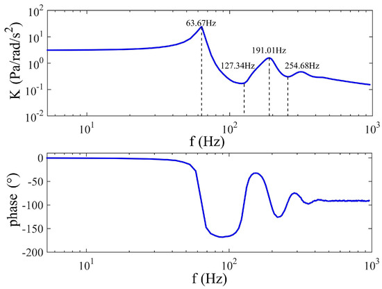 The proposed model, which contains the fluid transients, together with the theoretical and experimental conclusions about the porous transducer and the wave speed, is used to obtain a typical frequency response of the fluidic system for , . The value of the wave speed does not influence the analysis because it mainly affects the natural frequency, which means a larger wave speed just makes a shift of the relation. To maintain consistency between simulation and experiment, the wave speed is set to be to make the theoretical natural frequency close to the actual value of the LCAA or the prototype. Furthermore, the theoretical natural frequency can be known from Equation (9) as and the numerical result of the frequency response is plotted in Figure 8. In this figure, the first peak of the system gain is found to be located at the theoretical natural frequency, , and there is a peak or a valley at each frequency that is the odd or even times , respectively. In solid vibration systems [36,37], the i-th peak is called i-th order resonance, while the j-th valley is called j-th order anti-resonance, and they correspond to the different system modes. Considering the similarity seen here, the names of resonance and anti-resonance are also adopted to illustrate the frequency response of the fluidic system. The heights of the peaks in Figure 8 are found to be less than the heights in Wolfaardt’s work [15] because the dynamic permeability of the porous transducer is believed to bring non-negligible damping to the fluidic system. Thus, the quantity of the resonance is limited, which is different from that seen in [15]. Moreover, the phase of the system changes rapidly at every resonance of anti-resonance, although the phase beyond the fourth resonance tends to remain invariant.