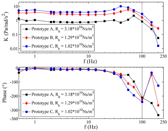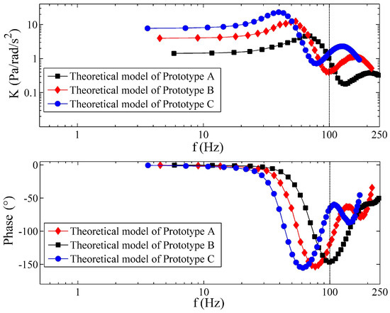 It can be concluded that the dynamic permeability model is similar to a first-order system that has a low-frequency gain and a corner frequency. The transducer with the larger permeability exhibits a smaller bandwidth since the corner frequency of the transducer with the largest permeability is near 1 kHz while the corner frequency of the other one approaches 100 kHz. Fortunately, the bandwidth of the transducer permeability is much larger than the bandwidth of the common fluid-based angular accelerometer (100 Hz) [9,11,14,15,16,17,18], as well as the best one (200 Hz) [34]. In most cases, it is not difficult to control the permeability of the transducer to maintain the bandwidth of the permeability apparently superior to the bandwidth of LCAA. Nevertheless, in some situations, if a porous transducer with large permeability or small hydrodynamic resistance is required to be applied in the sensor, the dynamic permeability would demonstrate great influence.
