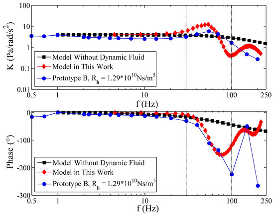 Without loss of generality, the experimental frequency responses of Prototype B are selected for comparison with the proposed model of this paper and the previous model without fluid dynamic consideration [16]. In Figure 12, the two theoretical models show favorable consistency with the measurements in the low frequency range (f < 30 Hz). However, when f > 30 Hz, the model without dynamic fluid consideration is not convincing, because the location and the peak of resonance in MFC and the phase change in PFC cannot be predicted. On the contrary, the model in this work is almost able to predict the variation of the frequency response of the fluidic system when f < 100 Hz. As for the f > 100 Hz, the pressure loss and phase lag resulting from the pressure measurement may have an unexpected influence on the results, which is difficult to predict with the given measurement technique. Because of the pressure loss, the low-frequency gains of the experiments are slightly lower than the theoretical values. Hence, a loss factor is defined by the ratio of the theoretical low frequency gain, Kth, of a prototype to the experimental low-frequency gain, Kex. The low frequency gain, Kth = 2πρR2, is known from [16], and the same value of Kth can be obtained by the proposed model in this work as shown in Figure 12. The average gain at the lowest three frequency points of each prototype is regarded as Kex. The results are shown in Table 4. The loss factor of each prototype varies in the range of 1.1–1.3, and the average loss factor is 1.2.