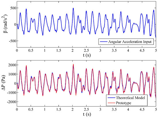 For the purpose of validating the output of the proposed model responding to the transient input, Prototype B was fixed to an arbitrarily rotating platform. The angular acceleration generated by this platform could be seen as a non-sinusoidal angular acceleration input to the prototype. The angular acceleration of the platform was detected by a fluid-based angular accelerometer, which is produced by the Beijing Automation Control Equipment Institute. It has good performance with a relative accuracy of 1%, a measurement range of −500~500 rad/s2, an output range is −12.5~12.5 V, a zero offset lower than 17°/s2 and bandwidth of 0.1–120 Hz. The signal detected by this accelerometer was regarded as the reference input signal and the output of the prototype was simultaneously recorded. To examine the transient performance of the proposed model, the reference input signal was inserted into the proposed model, in which the actual parameters of prototype were used with the ratio of the gas in the tube assumed to be 5%. Since the loss factor has been determined in Table 4, the differential pressure measured by the prototype was corrected by multiplying the average loss factor of 1.20. The transient theoretical output of the fluidic system is compared with the output of the prototype in Figure 13. It is noticed that the outputs of the theoretical model are consistent with the signal of the prototype with 1.4% relative error, and the details in the angular acceleration variation can be reflected by the theoretical model. In other words, the transient response of the fluidic system reacting to non-sinusoidal input can be predicted by the proposed model.