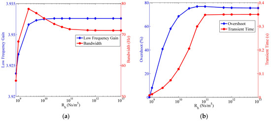 Figure 14 shows the influence of the hydrodynamic resistance on the four indexes. The size of the transducer is also set to be , , and is determined when water is the fluid. The low frequency gain of the fluidic system is unchanged until the hydrodynamic resistance decreases to less than . When compared with the slight variation of the low frequency gain, the bandwidth exhibits greater change when . The largest bandwidth is obtained with , although the system bandwidth decays quickly with lower hydrodynamic resistance. Furthermore, the overshoot and the transient time of the step response demonstrates analogous correlation with . If , less overshoot and transient time result from the reduced hydrodynamic resistance, which means that the fluidic system reacts to the step input more quickly.