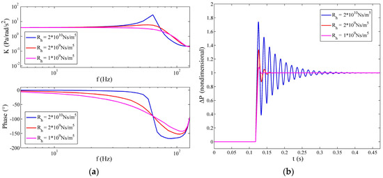 Relationship of the fluidic system indexes versus the hydrodynamic resistance of the porous transducer, where (a) Variation of the low frequency gain and the bandwidth; (b) variation of the step response overshoot and the transient time.