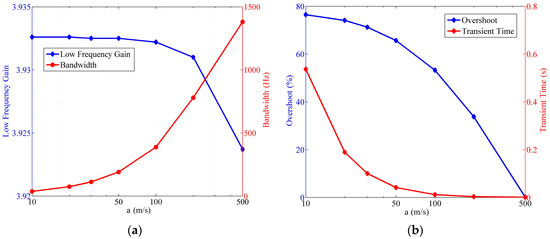 Relationship of the fluidic system indexes versus the wave speed, where . (a) Variation of the low frequency gain and the bandwidth; (b) variation of the step response overshoot and the transient time.