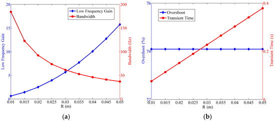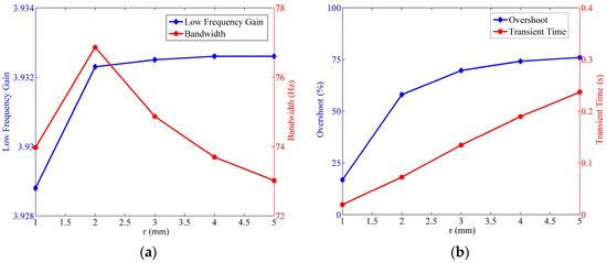 Relationship of the fluidic system indexes versus the cross-section radius of the circular tube, where . (a) Variation of the low frequency gain and the bandwidth; (b) variation of the step response overshoot and the transient time.
