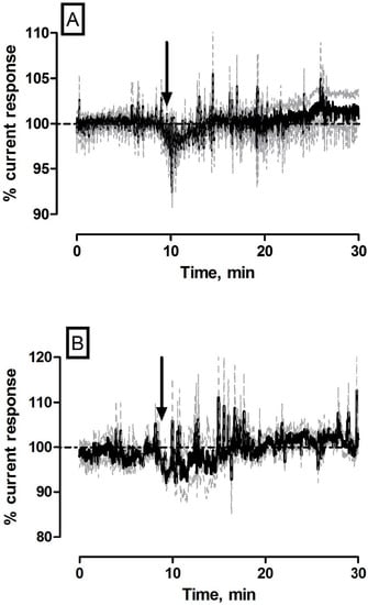 Averaged raw data % current response of (A) NO and (B) O2 sensors implanted in the striatum of NOD SCID mice (n = 5) to a 1 mL·kg−1 injection of 0.9% saline. Arrows indicate point of injection. Mean % current response represented by black trace, % error represented by grey trace.