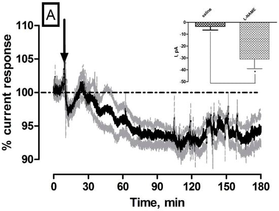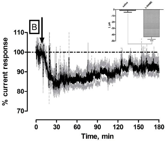 l-NAME is a non-selective nitric oxide synthase (NOS) inhibitor which exerts its function through direct competition with the pre cursor L-arginine for its binding site on the NOS enzyme []. NOS inhibition has been shown to induce constriction of cerebral vessels and decrease tissue blood flow in the brain providing evidence that basal NO is involved in the maintenance of cerebral perfusion [,,]. The averaged raw data % current traces following the systemic administration of 30 mg·kg−1 l-NAME (n = 5) are illustrated in Figure 2. The maximum current change for NO (−31 ± 8 pA) and O2 (−44 ± 4 nA) sensors were significantly different from pre-injection baseline levels (436 ± 86 pA (p < 0.01) and 199 ± 12 nA (p < 0.001) respectively. Furthermore, significant changes against saline controls were observed for both NO (p < 0.05, see Figure 2A inset) and O2 (p < 0.001, see Figure 2B inset). Maximum responses were recorded for NO (41 ± 18 min) and O2 (28 ± 6 min) that corresponded to percentage changes of (NO, −6% ± 1% and O2, −19% ± 3%) and concentration changes of (NO, 30 ± 8 nM and O2, 26 ± 2 µM) based on pre-calibration data. The currents had reached a new recorded level for NO (430 ± 84 pA, p = 0.17) and O2 (181 ± 12 nA, p < 0.01) after 180 min. These results corroborate previously reported findings whereby l-NAME has been utilised in the characterization of the NO sensor in wistar rats to great effect [,]. Heretofore, its application in O2 sensor characterization studies has not been reported. Notwithstanding this, it is an ideal compound for characterization studies since the tissue O2 current measured by the amperometric sensor is determined by the balance between vasculature supply and cellular utilisation. By this rationale, the decrease observed in Figure 2B can be attributed to a decrease in O2 supply arising from vasoconstriction and utilization remaining constant. A net decrease in O2 current is thus recorded. Taken collectively, a decrease in both NO and O2 current over a 180 min support a correlatory response and thus provide direct real time evidence of NO’s involvement in cerebral circulation. However, a slight discrepancy in maximum response times is observed which could be explained by the non-selective nature of l-NAME. Specifically, inhibition of endothelial NOS (eNOS), which is localised to the smooth muscle of blood vessels, would exert its effect directly on blood flow by inducing vasoconstriction which would reduce the levels of O2 available in the brain extracellular fluid. Moreover, it is a generally accepted phenomenon that neuronal NOS (nNOS) is the most abundantly present isoform in the brain that is tightly associated with NMDA receptor function on post synaptic membranes [].