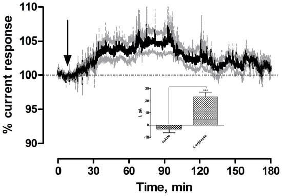 The nitrogen of NO is derived from the guanidine nitrogen atoms of l-arginine and the oxygen from molecular O2 with the production of a stoichiometric equivalent concentration of the co-product l-citrulline []. l-arginine has been used previously to characterize the NO sensors in freely moving rats with significant differences observed against baseline and control saline administrations [,]. Furthermore, local perfusion of the precursor using retro-microdialysis initiated significant increases in NO current []. The averaged raw data trace following the systemic administration of 200 mg·kg−1 l-arginine is illustrated in Figure 3. A significant increase (p < 0.001) in current was observed (23 ± 4 pA, n = 5) in comparison to pre-injection baseline levels of 545 ± 99 pA and against saline controls (p < 0.001, see Figure 3 inset). This current change reached a maximum level after 48 ± 9 min and corresponded to a percentage change of 5% ± 1% and concentration change of 22 ± 4 nM based on pre-calibration data. A new baseline current of 545 ± 98 pA was reached after 128 ± 18 min and was not significantly different (p = 0.95) when compared against initial pre-injection levels. These results confirm that amperometric currents increase following systemic administration of the pre-cursor in NO synthesis, l-arginine, supporting the efficacy of the sensor in determining increasing NO concentrations.