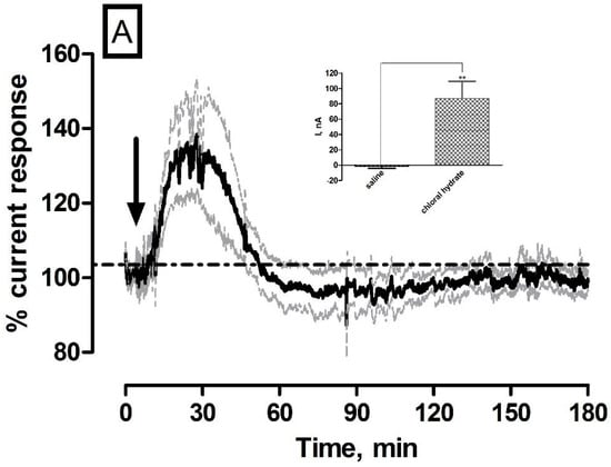 Systemic administration of the non-volatile anaesthetic chloral hydrate was utilised to investigate its effect on striatal O2. The anaesthetic response has been previously characterized using the amperometric O2 sensors in freely moving rats with a long lasting increase in current recorded over a number of hours []. It causes general CNS depression by rapidly metabolising into trichloroethanol and trichloroacetic acid. The chloral hydrate effect on suppressing neuronal activity is quick, resulting in a large increase in O2 current due to the supply of O2 from the vasculature exceeding its utilisation. The averaged raw data % current trace following the systemic administration of 350 mg·kg−1 chloral hydrate is illustrated in Figure 4A. A significant increase (p < 0.05) in current was observed (87 ± 22 nA, n = 5) in comparison to pre-injection baseline levels of 201 ± 10 nA and against saline controls (p < 0.01, see Figure 4A inset). This current change reached a maximum level after 13 ± 2 min and corresponded to % change of 40% ± 15% and concentration change of 51 ± 13 µM based on pre-calibration data.