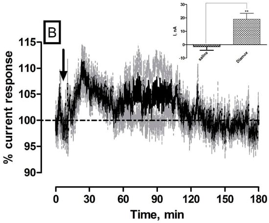 The carbonic anhydrase inhibitor acetazolamide (Diamox) has been shown to increase cerebral blood flow (CBF) and O2 levels in both humans and animal models [,]. Measurement of the CBF or blood velocity response to Diamox is commonly used to assess the vasodilatory capacity of the cerebral circulation and moreover, it has been routinely utilised in the characterization of the amperometric O2 sensor in Wistar rats []. The averaged raw data % current response following 50 mg·kg−1 Diamox administration (n = 5) is detailed in Figure 4B. Briefly, the maximum current change (19 ± 4 nA) was significantly different from pre-injection baseline levels (221 ± 23 nA (p < 0.05) and against saline controls (p < 0.01, see Figure 4B inset). A maximum response was recorded after 15 ± 3 min that corresponded to a percentage change of 8% ± 2% and a concentration change of 11 ± 2 µM based on precalibration data. The currents had returned back to a new recorded level (220 ± 23 nA, p = 0.80) after 97 ± 27 min. These results strongly corroborate previously reported findings from sensors implanted in wistar rats [] and confirm the efficacy of the O2 sensor at measuring concentration changes in the striatum of NOD SCID mice.