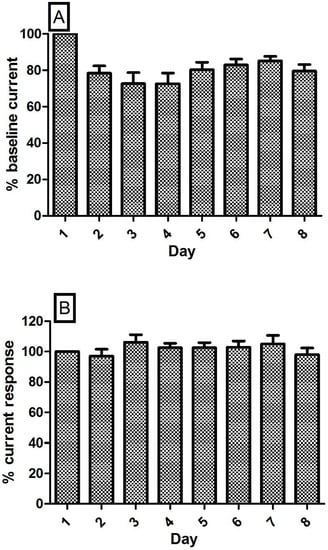 The mammalian brain presents a complex chemical environment that includes electrode poisons such as lipids and proteins and a tissue matrix that both restricts mass transport to the electrode surface and reacts physiologically to the presence of the sensor. It is imperative that the sensor demonstrates efficient stability for continuous long term recordings. The potential benefits of pre-treating microelectrodes with lipids [,] and proteins [] has been investigated by research groups to permit more accurate pre-calibration techniques by mitigating this sensitivity decrease observed upon implantation. These studies have established that exposing the electrodes to fouling agents in vitro may serve as a good model of the behaviour of implanted sensors in brain tissue. Previous in vivo investigations using the described NO and O2 sensors in the brain ECF of freely moving rats, confirm no significant difference in mean baseline NO current over a successive eight day period [] or in the mean baseline O2 current over a number of weeks []. This follows an early reduction in baseline stability which has been corroborated by other groups where a decrease in sensitivity has been observed following initial exposure of sensors to brain tissue [,]. A similar phenomenon was observed in the striatum of NOD SCID mice. Figure 5 illustrates the average % baseline current recorded from the mice over an eight-day period which supports previous evidence recorded from Wistar rats. Day 1 baselines were normalised to 100% and all subsequent baselines are normalised to a percentage of the baseline recorded on Day 1.