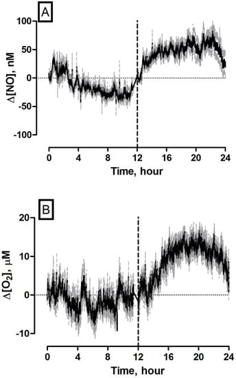 Averaged 24 h concentration dynamics measured using (A) NO and (B) O2 sensors implanted in the striatum of NOD SCID mice. Mean concentration represented by black trace, error represented by grey trace. 0–12 h represent light phase (07.00–19.00) and 12–24 h represent dark phase (19.00–07.00). Vertical dashed line signifies end of light phase/start of dark phase.