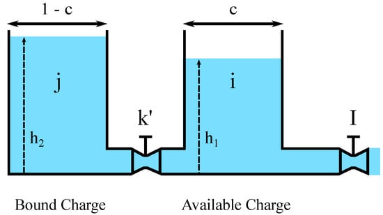 The available charge tank holds an electrical charge that can be immediately used for a device draining current I. The bound charge tank holds a bounded charge that can flow towards the available charge tank, regulated by a valve with a fixed conductance . Such a constant corresponds to the rate of a chemical diffusion/reaction processes. Constant c corresponds to the total charge ratio stored in the available charge tank. A battery is exhausted when its available charge tank becomes empty, whatever the state of the bound charge tank. The transfer of charge, as well as the amount of unavailable charge are proportional to the difference of the heights between both tanks, . Thus, a smaller difference between these two height values provides a longer lifetime for the battery [31]. The following system of differential equations describes KiBaM.