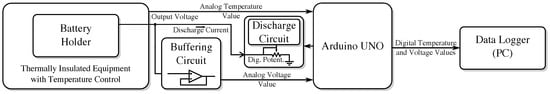 An Arduino UNO controls all circuit components and collects the experimental data from the batteries’ board: battery voltage and temperature. The UNO board has analog inputs with 10-bit resolution, the data log interval being adjustable. For the performed assessments, data were recorded every 10 s. A computer receives the collected data from the UNO board through a USB connection using CoolTerm [37], which stores all data in a TXT file for further analysis.