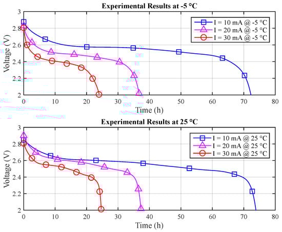 Three experimental assessments were performed for each of the above-mentioned temperature values and for each of the following discharge current values: 10, 20 and 30 mA (actually, due to the available 256 resistance values obtained from the digital potentiometer, the considered current values were: 10.424, 20.303 and 30.242 mA). A total of 45 experiments were performed, three for each current/temperature pair. Thus, average lifetime/voltage values from three experiments were considered for each measurement presented in this paper.