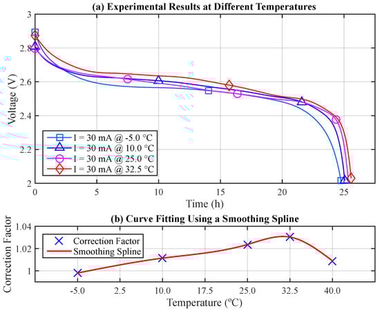 I being the discharge current and a and b experimentally-obtained constants. Ideally, a corresponds to the battery capacity, and b is equal to one. In this comparison, the value of a was set at 0.75 Ah, which corresponds to the nominal battery capacity, and b was adjusted according to the experimental results at 25 °C using the discharge current I = 30 mA. Thus, b = 1.0067.