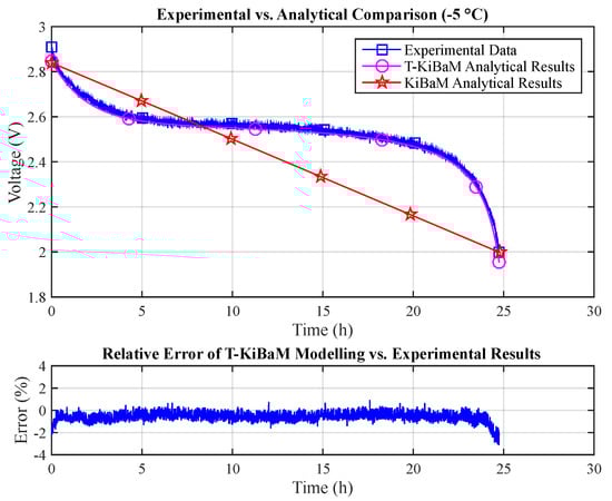 Note that KiBaM presents the same results in all analytical assessments, since this model is not able to handle different temperatures. In addition, KiBaM represents linearly the voltage behavior, which causes a significant error in relation to the experimental data when analyzing different cut-off points, as in the range between 2.0 and 2.5 V. On the other hand, T-KiBaM is able to deal more accurately with voltage tracking at different temperatures. For instance, at T = −5 °C (Figure A1 top-left), analyzing the voltage level equal to 2.4 V, the relative error to the experiment of KiBaM is 37.53%, while in T-KiBaM is 0.73%.