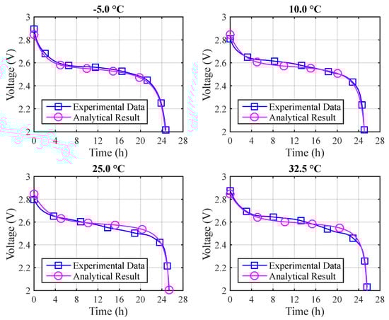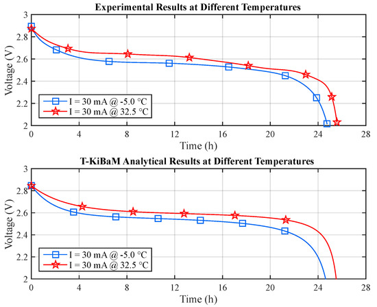 Table A1 illustrates a comparison between experimental and analytical results for each of the assessed temperatures. The EXP column represents the average discharge time of three discharge experiments using different batteries of the same model, i.e., Panasonic HHR-4MRT/2BB.