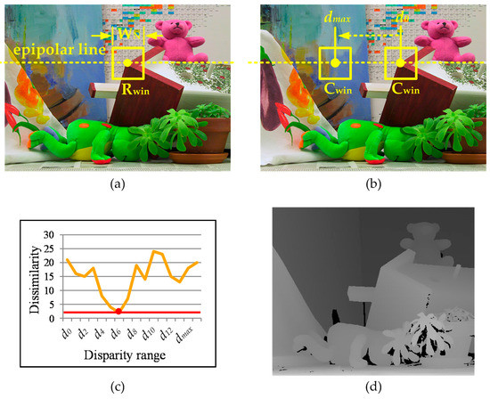 (a) Left image (Rwin: reference window); (b) right image (dx: disparity range, Cwin: candidate window); (c) dissimilarity between Rwin and Cwin; and (d) a depth map.