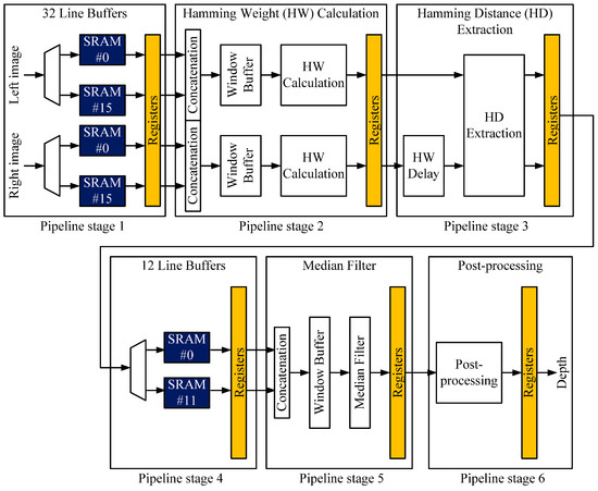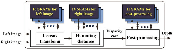 As shown in Figure 3, the size of memory is determined primarily by the width of the image and the height of the window. The former equals the depth of each SRAM and the latter the number of SRAMs. As the width of the image increases, therefore, the size of the SRAM increases; as the size of the window increases, the required number of SRAMs increases accordingly. However, a large number of interconnections between the SRAMs and logic cells will cause performance degradation resulting from high routing congestion and the longer wire lengths in 2D ICs. We used an eight-bit, gray-level 752 × 480 image and a 15 × 15 window for the stereo matching and an 11 × 11 window for the post-processing. We chose these window sizes because of their high degree of matching accuracy [22]. Figure 4 shows the fully pipelined hardware architecture of the stereo matching processor, and Table 2 summarizes the features of the stereo matching processors.