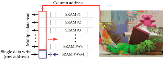 To run the matching algorithm using a pair of stereo images, the window-based stereo matching algorithm requires sufficient memory. Thus, the primary goal of the stereo matching architecture is to efficiently buffer both the left and right images on the memory so that the stereo matching processor can generate a depth map in real time. To fulfill this requirement and to deal with the requirement of a wide bandwidth, we used small, highly partitioned SRAMs and conducted a window-based operation using a finite number of them. Figure 3 illustrates how the window is generated with the finite number of SRAMs and then propagated horizontally. A pair of stereo images are consecutively acquired by a stereo camera, stored in the SRAMs in rows, and processed in columns for window-based matching. As a result, during each cycle, this architecture can concurrently perform multiple reads and a single write operation. Thus, the stereo matching processor can handle the requirements of a wide bandwidth.