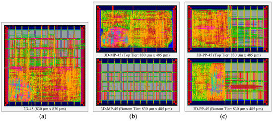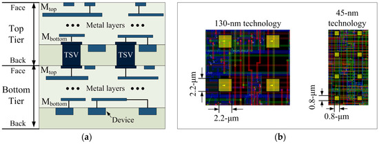 We designed our 2D and 3D ICs using GlobalFoundries 130-nm and Nangate 45-nm process design kits (PDKs). To generate 44 single-port SRAM macros composed of six-transistor bit cells, we used an ARM memory compiler (ARM Inc., San Jose, CA, USA). We chose this commercial technology setting because it was successfully used in the development of a 3D IC built with GlobalFoundries 130-nm process technology and Tezzaron’s TSV-based vertical stacking technology [10]. We connected two tiers of 3D ICs using via-first TSVs with the face-to-back bonding style for 3D integration, shown in Figure 5. The diameters of the TSVs were 2.2 μm for the 130-nm and 0.8 μm for the 45-nm designs. Because the capacitance and resistance of TSVs are not negligible in timing and power analyses, we used 10 fF and 2 fF for the capacitance of the TSV and 50 mΩ and 10 mΩ for the resistance of the TSV, respectively, during the timing and power analyses of our 130-nm and 45-nm designs. We used simulated values for the capacitance and resistance of TSVs.