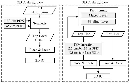 In contrast to the goals of the work mentioned above [7,8,9,10,11,12,13,14], one of the primary goals of this research is to analyze the influence of reduced wire length that results from vertical stacking on power consumption by comparing 3D ICs with their 2D IC counterparts. In addition, we expand our previous work [15] to investigate the impact of technology process scaling (130 nm down to 45 nm) and TSV scaling (2.2 μm down to 0.8 μm) on the power and area benefits of 3D stacking. We design our 3D-stacked stereo matching processors using GlobalFoundries 130 nm and Nangate 45 nm process design kits (PDKs) and compare them with their 2D IC counterparts regarding power consumption and wire length. For a fair comparison of 3D and 2D ICs, we use the same target clock period and logic synthesis output during implementation. In this work, we also propose a pipeline-based partitioning scheme that reduces TSV use and then compare its performance with that of a conventional partitioning method. Our study is based on graphic database system II (GDSII)-level layouts, on the sign-off performance, and on a power analysis for a highly accurate assessment of the issues.