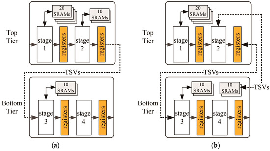 The purpose of this partitioning method is to minimize the number of TSVs and to balance the die sizes of the tiers with minimal effort in a pipelined hardware architecture. In this partitioning method, we adhere to the basic concept of pipelining (in which memory is dedicated to its own pipeline stage, shown in Figure 4) by simply splitting the pipeline stages into two groups and assigning the first three pipeline stages (1, 2 and 3) to the top tier and the remaining pipeline stages (4, 5 and 6) to the bottom tier. In this case, the number of TSVs is determined by the number of signals between the two groups. However, simply dividing the pipeline stages into two groups does not guarantee a balance of die sizes of the tiers. Therefore, we balanced them by moving the memory macros from the top to the bottom tier. In this case, the number of TSVs increased as the number of adjusted memory macros increased. Figure 8 illustrates the two steps of the pipeline-level partitioning method. In this example, we assumed that the silicon areas of each stage were identical.