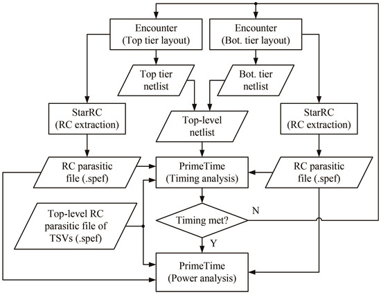 We conducted a static timing analysis (STA) using Synopsys PrimeTime with the layout netlist and an RC parasitic file that contained the resistance and capacitance values for all of the nets. Then, if the timing was met, we performed a power analysis using PrimeTime. Figure 9 presents the flow of the power and timing analyses. We performed the timing and power analyses using PrimeTime with the layout netlist and the RC parasitic file of each tier. Although existing commercial tools can perform a timing and power analyses for 2D IC design, they cannot handle 3D IC designs. Thus, for the 3D IC analysis, we created a top-level netlist by combining the netlist of the tiers and a top-level RC parasitic file for the TSVs. Then, we merged three parasitic files (two from the two dies and one from the TSVs) into one and used it to perform 3D timing analysis. We also used the combined parasitic files to obtain timing constraints at the die boundary and performed timing optimization. If the timing was met, we conducted a power analysis. Our power comparisons were done in iso-performance. We used the same target clock period during the layout and timing optimization for both the 2D and 3D designs. We used 3.2 ns for the 130-nm and 1.8 ns for the 45-nm 2D and 3D ICs. The clock-tree synthesis for the 3D IC was difficult because no commercial EDA tools are able to fully handle clock trees for 3D ICs. Thus, we treated each tier as if it had its own clock-tree network and then performed clock-tree synthesis separately. Then, we directly connected the clock sources of the top and bottom tiers through a TSV.