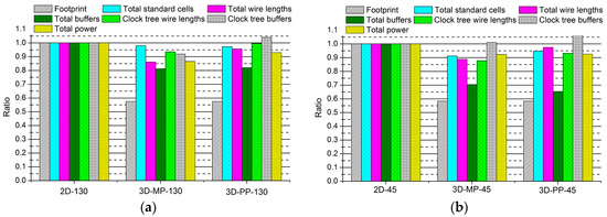 In contrast to the results of the comparison of footprints, wire lengths, buffers, and power, the results of 3D stacking from the clock-tree analysis did not exhibit any benefits. In the case of the 3D-PP-130, although the wire length of the clock tree was 7% shorter than that of the 2D-130, its number of clock-tree buffers was 4% higher than that of the 2D IC. Similarly, the number of clock-tree buffers of 3D-MP-45 and 3D-PP-45 were 1% and 10% higher, respectively, than that of 2D-45. One explanation for this finding is that we performed clock-tree synthesis separately for the top and bottom tiers and then directly connected the clock source of the bottom to that of the top tier through a TSV. In this case, we used existing commercial electronic design automation (EDA) tools to perform the clock-tree synthesis without any awareness of the other clock tree. Thus, the clock tree of the 3D IC was not well optimized. As 3D-MP-130 and 3D-MP-45, however, did not have a large clock-tree network on the bottom tier, they suffered less from the clock-tree optimization problem.