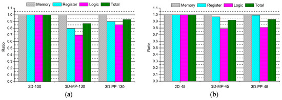 Comparisons between the normalized designs of 2D and 3D ICs: (a) 2D and 3D ICs designed in 130-nm process technology; and (b) 2D and 3D ICs designed in 45-nm process technology.