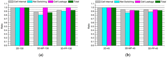 To study the source of the power reduction in 3D ICs, we performed various power analyses. First, as shown in Figure 13 and Figure 14, we observe that most power savings are achieved in the combinational logic and net switching power, indicating that the reduced number of buffers in the interconnection plays an important role in reducing the power consumption of 3D IC designs. In addition, we also observe that in contrast to the 3D ICs designed in 130-nm technology, which have negligible cell leakage power, the cell leakage power of the 45-nm 3D IC is as much as 7% less than that of the 2D IC. This is mainly because the number of buffers of the 45-nm process technology-based 3D ICs (3D-MP-45 and 3D-PP-45) are 30% and 35% less than that of 2D IC (2D-45), which results from vertical stacking and the reduced wire length. This result also indicates that as the process technology scales down, cell leakage power increases power consumption mainly because leakage power in 130-nm technology is negligible, but the proportion of leakage power in 45-nm technology is higher than it is in 130-nm technology.