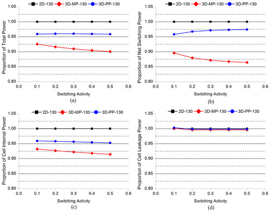 Comparisons of the normalized power of 2D and 3D ICs as a function of switching activity: (a) Total power; (b) net switching power; (c) cell internal power; (d) cell leakage power. Note that the power consumption of 2D-130 actually increases as the switching activity increases.
