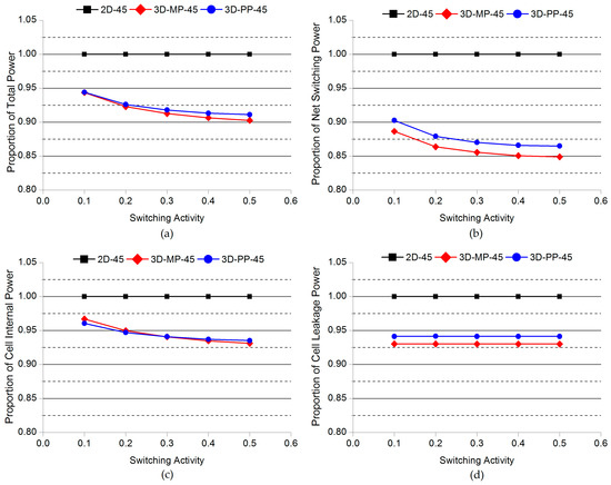 Comparisons of the normalized power of 2D and 3D ICs as a function of switching activity: (a) Total power; (b) net switching power; (c) cell internal power; (d) cell leakage power. Note that the power consumption of 2D-45 actually increases as the switching activity increases.