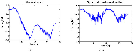 In the 2-D closed experiment, the ZUPT-aided INS can track the pedestrian feet positions (Figure 4), but the distance of two feet reaches about 6 m, which is unreasonable in pedestrian navigation. Comparing the three different sets of trajectories, the position estimation information under the ellipsoidal restriction can obtain the position estimates more accurately. Figure 5 shows the relative positions of the two feet in the axis direction. Since constrains the altitude difference, the feet height difference can be reduced near to the true value and the pedestrian location can be more accurate.