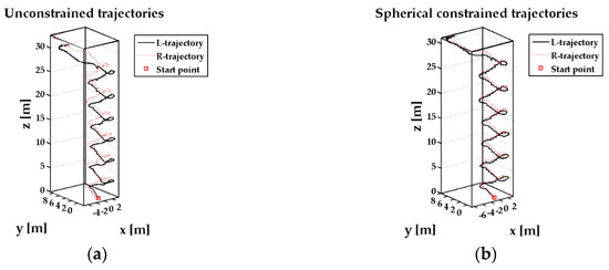 For estimation evaluation, we have chosen the root mean square error (RMSE) as an accuracy measure in this work. This is used to measure the difference between the actual values and the output of an estimator. For quantitative comparison, we only checked the starting and final positions, both in 2D and 3D, in all walking tests. We assume the starting position of the left foot and right foot as (0, 0.1, 0) and (0, –0.1, 0), hence, only the final estimates are inserted into the RMSE formula. Both of these quality indicators are given in comparison Table 2. Note that the unconstrained method represented the results of only ZUPT corrections. Both spherical and ellipsoidal constraint methods can reduce the 2D and 3D trajectories error, but the latter obviously reduces the proportion more, and the correction effect is more obvious.