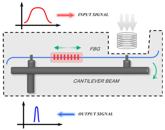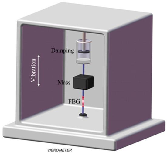 When vibration occurs, the mass, m, senses an inertial force with the opposite direction to that of initial vibration. The FBG is strained alternatingly in extension and compression, with time-varying strain . The relationship between the axial strain and inertial force is expressed by: