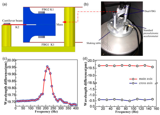 The 1D accelerometer is only required to respond to vibration along a single axis. The key to success is to transfer vibratory motion along the desired axis only, to the FBG by appropriate design of the mechanical transducer. At the same time, the mechanical transducer also determines the sensitivity, the mechanical response frequency and bandwidth of the sensor. In previous work, our group proposed a hybrid cantilever beam-based FBG accelerometer [103], as shown in Figure 3. The moving component of the sensor consists of an elastic rectangular cantilever beam and a pair of relatively massive L-shaped aluminum blocks. The cantilever beam, made from spring steel, supports the mass block formed by bolting the aluminum blocks back-to-back. FBG1 and FBG2 are pre-stressed each with one end fixed to the upper and lower surfaces of the mass block, respectively, and to a support pillar at their other ends. When vibration is applied vertically, the mass moves up and down, compressing and stretching FBG1 and FBG2 in opposite senses. In this work, the cross-axis sensitivity is decreased to 3.2% thanks to the dual-beam’s directional vibration responses, as shown in Figure 3d. Furthermore, the temperature is self-compensated based on the same responses to temperature of two reflection wavelengths. Finally, a considerable sensitivity of 215.6 pm/G is achieved stably over the frequency range of 10 Hz to 150 Hz.