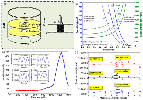 In the above work, the resonant frequency of the accelerometer is dependent on the mass of the mass block and the characteristics of the cantilever beam. The measurement of vibration at higher frequency requires different sensor structures. For example, another accelerometer for higher frequency vibration we demonstrated employed a cooper diaphragm-shaped structure [104]. As shown in Figure 4a, a cylindrical mass is sandwiched between two horizontal diaphragms mounted inside a vertical cylindrical shell. A FBG is pre-tensioned and attached to a fixed upper cover plate and the mass block, at points A and B respectively. The mass moves with the environmental vibration along the vertical (z) direction and repeatedly stretches and compresses the FBG. Factors that influence the sensitivity and frequency response of the accelerometer are the inertial mass (M), the ratio of the mass radius to diaphragm radius (Ri/R0) and Young’s modulus of the diaphragms. The demonstrated mechanical resonant frequency of the accelerometer was above 1200 Hz thanks to the dual-diaphragm-shaped structure and the large Young’s modulus of the diaphragm. In addition, the inertial mass is fixed between the two diaphragms. The vibration response occurs only along the z-direction, i.e., the motion of the mass has only a single degree of freedom. The directivity of the sensor effectively avoids cross-talk from vibration in the x- and y-directions. Varying the mass changes the amplitude-frequency response of the sensor, as shown in Figure 4b. Figure 4c shows the sensitivity and resonant frequencies at masses of 5, 10 and 20 g. The sensor has demonstrated good stability over the whole frequency bandwidth, here taking several cases at the vibration frequency of 100 Hz, 600 Hz and 800 Hz, as shown in Figure 4d.