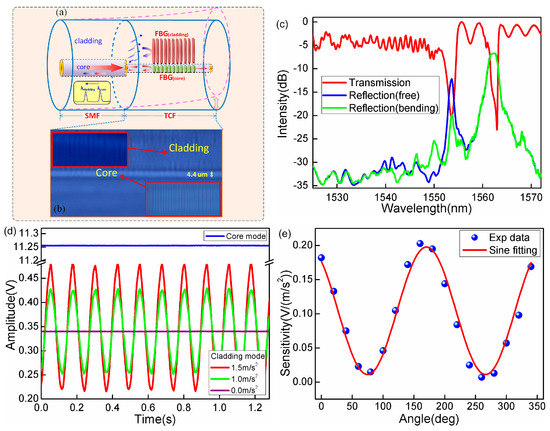 (a) Schematic diagram of TCF-FBG directional accelerometer; (b) Image of TCF-FBG, insets show the zoomed images of gratings in fiber cladding (up) and fiber core (bottom); (c) The transmission spectrum of TCF-FBG with two well-defined resonances; (d) Real-time power output of cladding mode and core mode (blue curve) under the same vibration condition; (e) Angular dependence of acceleration responsivity of sensor.