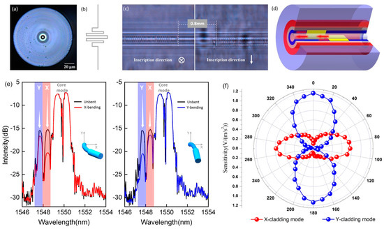 (a) Cross-sectional photomicrograph of the MCF-FBG; (b) Refractive index profile of the MCF-cross section; (c) Longitudinal photomicrograph of gratings inside MFC; (d) Schematic of the vector grating; (e) Spectra of the vector-FBG; (f) Angular dependence of acceleration responsivity of this sensor.