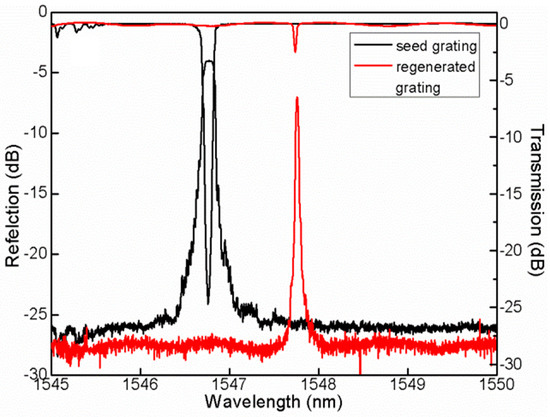 Reflection and transmission spectra of seed gratings (black curve) and regenerated fiber Bragg gratings (red curve).