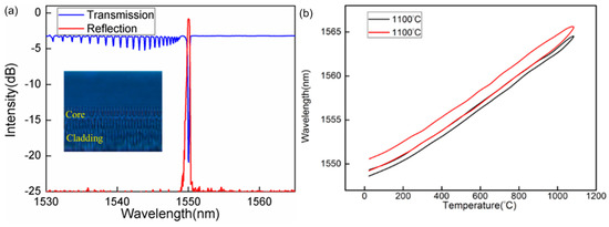 (a) Reflection and transmission spectrum of FBG written in a SMF (inset is imaging photo of FBG); (b) FBG wavelength versus temperature up to 1100 °C.