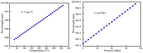 FBG sensor peak wavelength versus (a) Temperature; (b) Pressure.