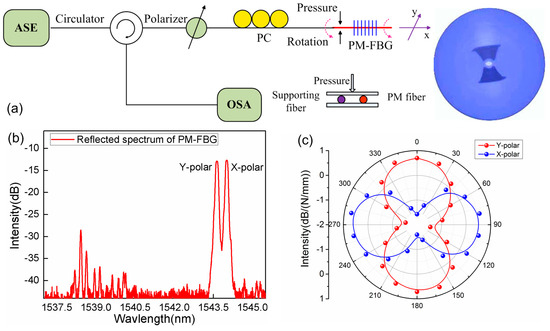 (a) Experimental setup for vector pressure measurement; (b) Reflection spectrum of PM-FBG with two polarized mode resonances; (c) Orthogonal responses of two polarized mode versus transverse stress.