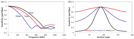 where ΔλUS is the shift of the grating, λS is the wavelength of the UW, L is the length of the FBG, εm is the displacement amplitude of the UW, λB0 is the unperturbed Bragg resonance wavelength, ν is the UW velocity in the fiber, and fS is the UW frequency. The equation clearly shows that the UW sensitivity of sensor is a function of the ratio λS/L, i.e., it is highly associated with the λS or fS. According to the theoretical analysis in [172,182], in particular, there are three main operating regions as follows: the first region corresponding to ν/fSL << 1, where Sλ approaches zero, so the grating response is practically insensitive to the UW. The second region, corresponding to ν/fSL ≈ 1, where Sλ increases with the ratio ν/fSL, the third region, corresponding to ν/fSL >> 1, where Sλ approaches a maximum value. The simulations in Figure 13 illustrates the discussion above, where the increasing length of the FBG decreases the response frequency band of the FBG. Besides, the detection orientation is another factor to influence the ultrasonic response of the FBG. As shown in Figure 13b, the FBG presents different sensitivities to the UW in different directions. Evidently, the sensor must be fixed in a suitable direction to get high SNR signal.