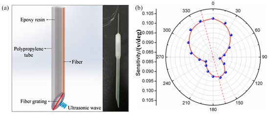 In general, there are two methods for realizing the coupling of UW-to-fiber. One is that UW is coupled to fiber through the fiber end-face, so that the efficiency is determined by the materials and size of the fiber end-face. The other is that the UW is applied laterally to the fiber. For the longitudinal wave, the latter method is more effective. In our group’s work, a π-FBG is mounted across the middle of tilted end face of a plastic tube, where the both ends of π-FBG are attached on the side of the tube, as shown in Figure 14a. The UW impinges directly on theπ-FBG (it is not transmitted along the fiber to avoid transmission loss). Because of the asymmetrical structure, the probe presents different sensitivities to the ultrasonic wave impinging from different directions, as shown in Figure 14b. The orientation-dependence can help tolocate the UW source.