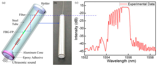 In the process of UW detection, it is sometimes not necessary to know the position of the UW source. The FBG can be sealed to provide protection from the hostile environment. As shown in Figure 15a, another sensor structure is formed as the follows. One end of the sensing fiber is mounted into the tip (with a hole) of an aluminum cone. A steel tube with a radius of 3 mm is used to package the sensing fiber. The cone tip is imbedded into the tube and is held by an epoxy resin adhesive. The other end is fixed in a hole through the middle of an aluminum plate embedded into the tube. A certain thickness of epoxy resin adhesive mixed with 5% tungsten powder is coated on the inside surface of the tube and the conical surface to absorb the stray and parasitic ultrasonic waves. The etched FBG-FP is pre-stressed and suspended in the middle of the steel tube. This sensor design presents an orientation-independent performance, which couples the UW energy component in the axial direction of the FBG-FP sensor, while cutting off any unwanted acoustic waves coming from stray reflections from surfaces present in the experimental test setup. During measurement, the directivity of the sensing probe only detects the reflected signal of the models, which is important to achieve a high spatial resolution, especially for the small defects in the model.