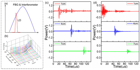 (a) Spectral side-band filtering mechanism; (b) FBG spectral response to ultrasonic; sensor’s responses to the pulse ultrasonic under the different distances and with different frequencies: (c) 300 kHz and (d) 1 MHz.