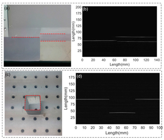 In the experiment, the models detected are placed in water to better index match the UW to the sensor. Since the seismic model is a reduced size of geology structure in equal proportion, the UW with frequency from 100 kHz to 10 MHz is usually employed to the imaging of the models. Here, we choose the sources providing 300 kHz and 1 MHz pulse UWs. In the experiment, the ultrasonic is partially reflected by the interface between air and physical models, e.g., the upper surfaces of models. Meanwhile, the models of Plexiglass materials allow the partials of ultrasonic passing over, and then being reflected by the defects in models, especially by the bottom surface. According to the information of the ultrasonic transmission velocity in water (1500 m/s) and models (2700 m/s), and the time flight in detection result, the thickness and defect positions can be determined. As the UW is applied to the FBG, the resonance spectrum shifts as shown in Figure 16b. The spectral side band technique transforms wavelength information into intensity information that is easier to measure and record. Figure 16c,d demonstrate the time domain spectra changes with the increasing distances at the fixed ultrasonic frequencies of 300 kHz and 1 MHz. The sensor is highly sensitive to the ultrasonic waves at the two frequencies. This result confirms the wide-frequency-band ultrasonic detection capability. With the increasing propagation distances, the detection voltage signal significantly decreases owing to the large loss of the ultrasonic energy in water.